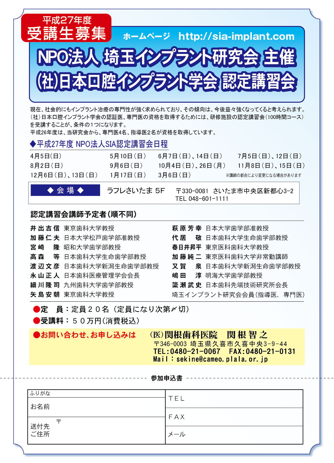 NPO法人 埼玉インプラント研究会では、平成27年度、日本口腔インプラント学会認定講習会を下記の通り行います。 日本口腔インプラント学会の専門医制度が正式に発足し、インプラント治療の専門性が強く求められる中、 この専門医の資格を取得するためには、研修施設の認定講習会(100時間コース)を受講することが条件の1つになります。