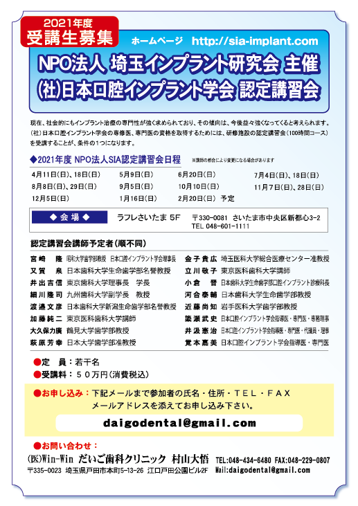 NPO法人 埼玉インプラント研究会では、令和3年度、日本口腔インプラント学会認定講習会を下記の通り行います。 日本口腔インプラント学会の専門医制度が正式に発足し、インプラント治療の専門性が強く求められる中、