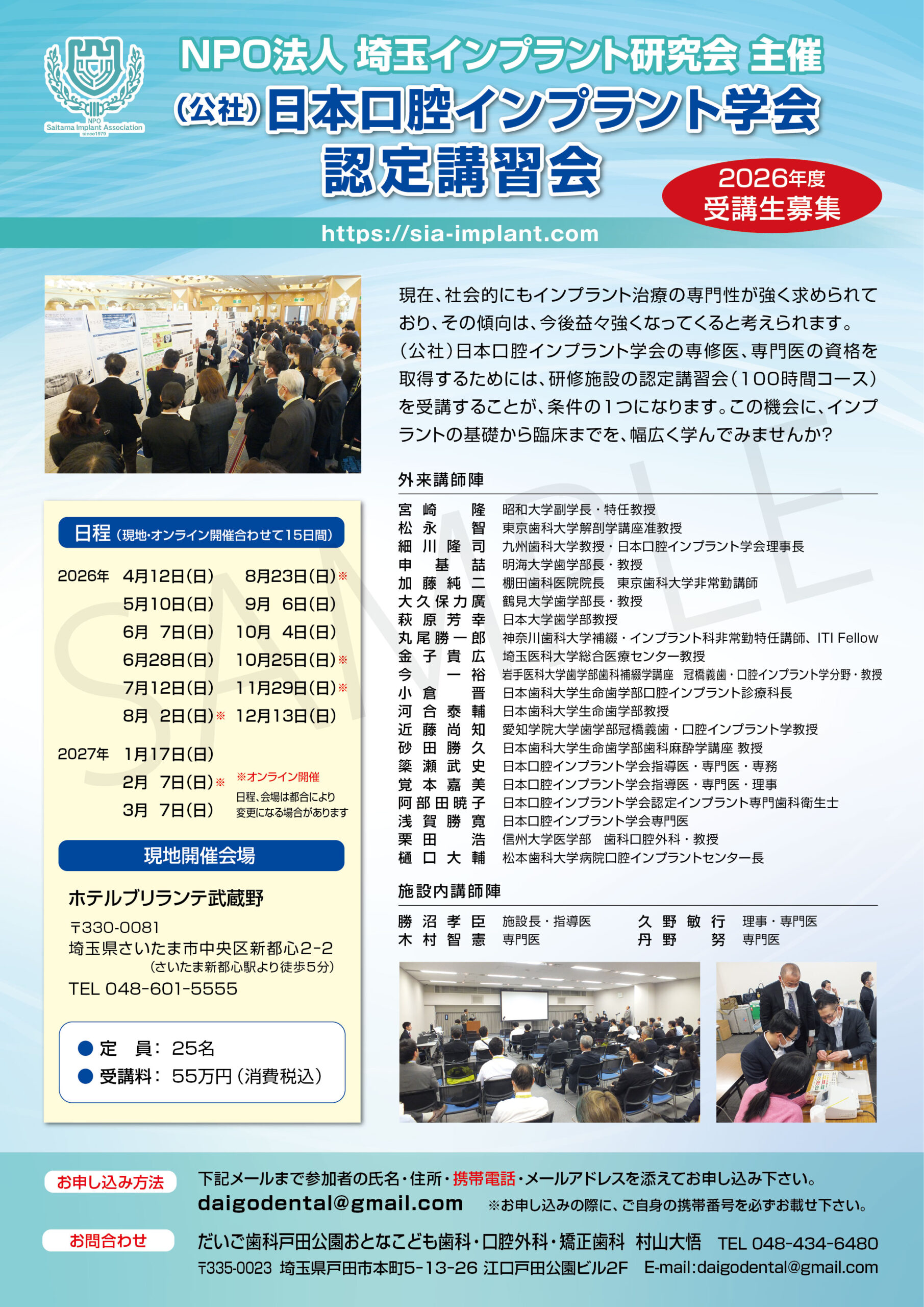 NPO法人 埼玉インプラント研究会では、令和6年度、日本口腔インプラント学会認定講習会を下記の通り行います。 日本口腔インプラント学会の専門医制度が正式に発足し、インプラント治療の専門性が強く求められる中、